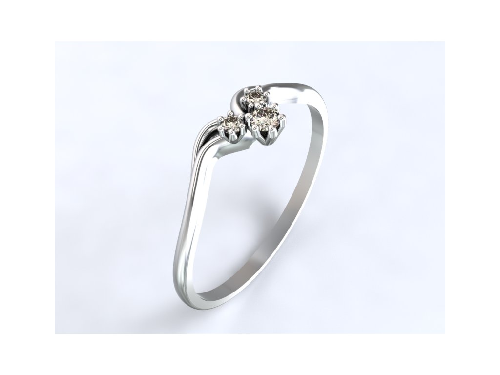 Zásnubní prsten se třemi kameny o průměrech 2x 1,5 a 2 mm. V případě diamantů celková váha kamenů 0,063ct, kvalita SI1/G,H.